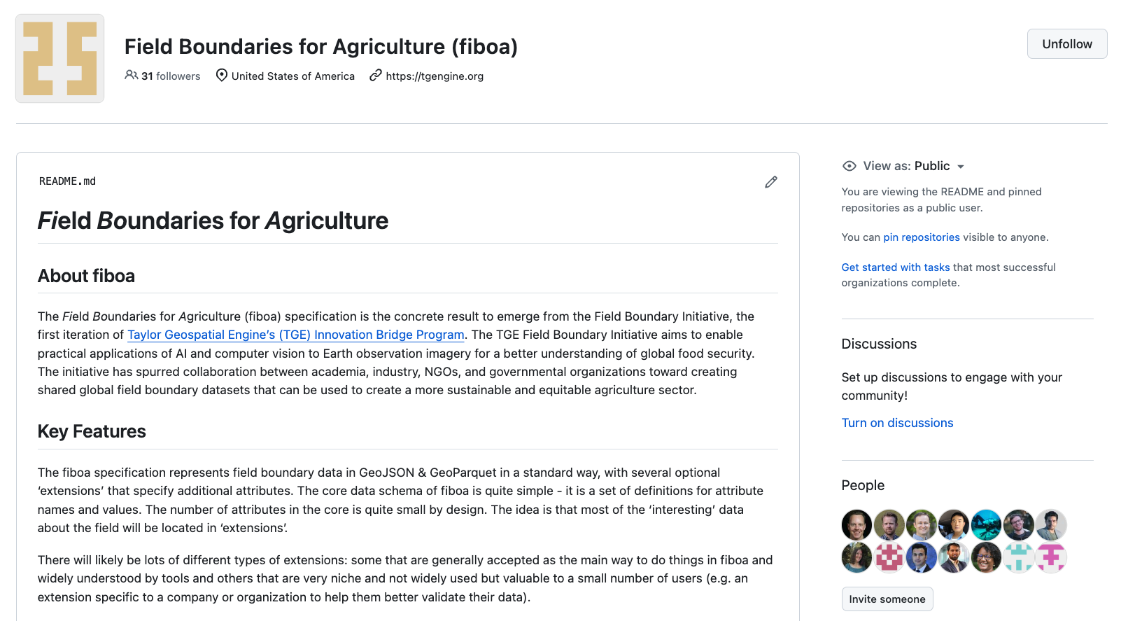 fiboa is the first concrete result from the TGE Field Boundary Initiative, which aims to enable practical applications of AI and computer vision to Earth observation imagery for a better understanding of global food security. The initiative has spurred collaboration between academia, industry, NGOs, and governmental organizations toward creating shared global field boundary datasets that can be used to create a more sustainable and equitable agriculture sector.