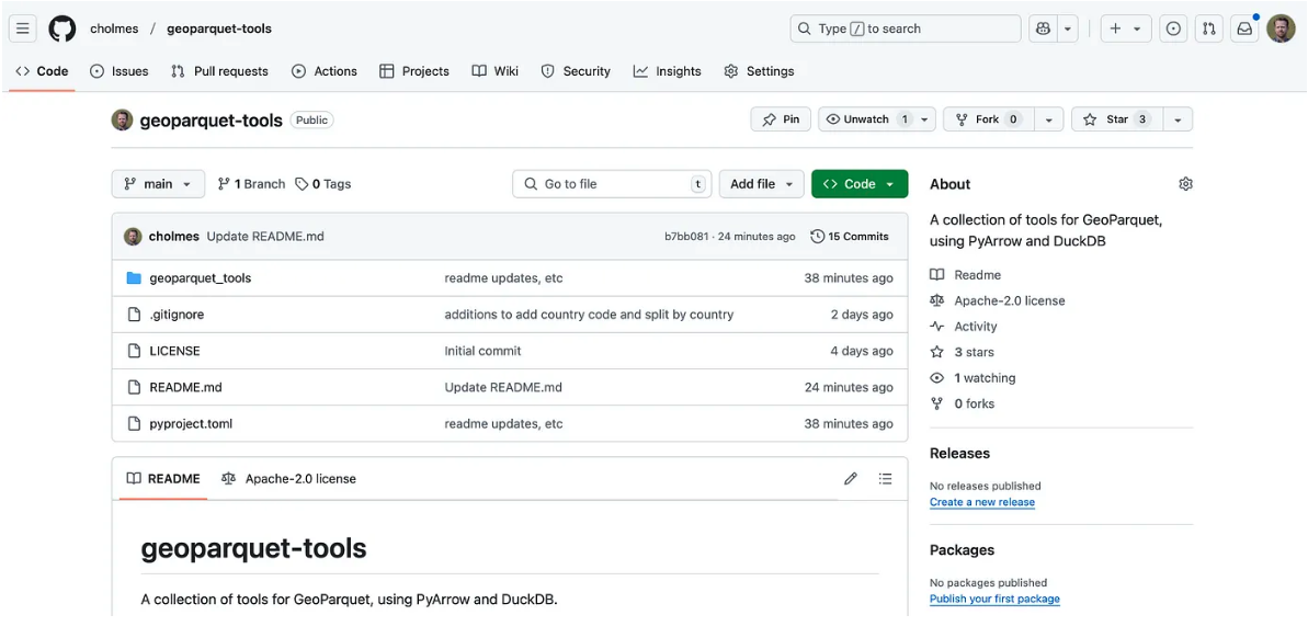 A goal for me this year is to ‘ship more’, so in the spirit of releasing early and often I wanted to share a little new project I got going this past weekend. See https://github.com/cholmes/geoparquet-tools.