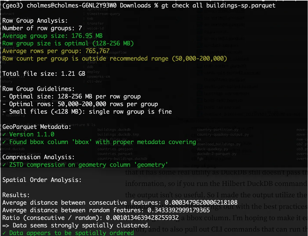 It’s a collection of utilities for things I often want to do but that aren’t trivial out of the box with DuckDB. It started focused on just checking GeoParquet files for ‘best practices’, which I’ve been working on writing up in this pull request, as I realized that lots of people are publishing awesome data as GeoParquet but don’t always pick the best options (and the tools don’t always set the best defaults). So it can check compression, if there’s a bbox column, and row group size. It also attempts to check if a file is spatially ordered, but I’m not sure if it works across different types of approaches. It does seem to work with Hilbert curves generated from DuckDB.
