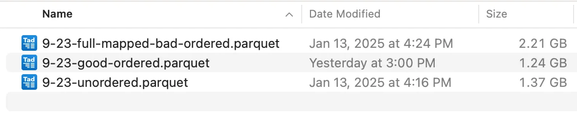 One cool thing is that proper ordering can help the size of the data, by enabling better compression. The original data was 1.37 gigabytes, and I believe was ordered by time. The badly ordered one was 2.21 gigabytes, and then the properly ordered one was only 1.24 gigabytes.